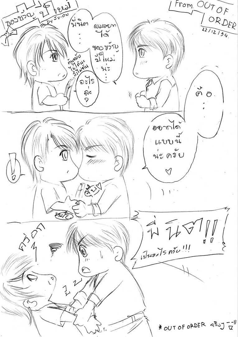 “พี่ไปอาบน้ำก่อนนะ”” ผมพูดเร็วปรื๋อ ก่อนจะชิงจังหวะ ชิ่งหนีจากมือเขา เดินออกจากห้องเข้าห้องน้ำไป โอ๊ย เผลอเป็นไม่ได้เลยนะเนี่ย เขาไม่รู้หรือไงว่าทำแบบนี้แล้วหัวใจผมจะวายเอา ชอบมาจับมาลูบอยู่ได้ พิศวาสอะไรผมนักหนาก็ไม่รู้